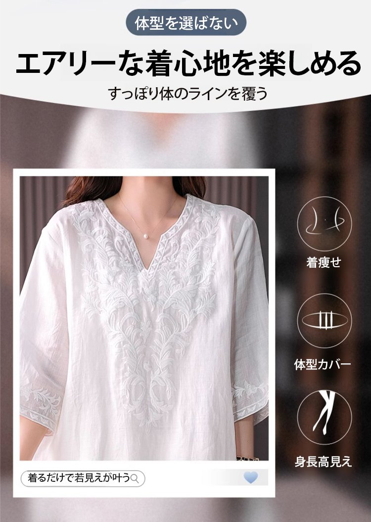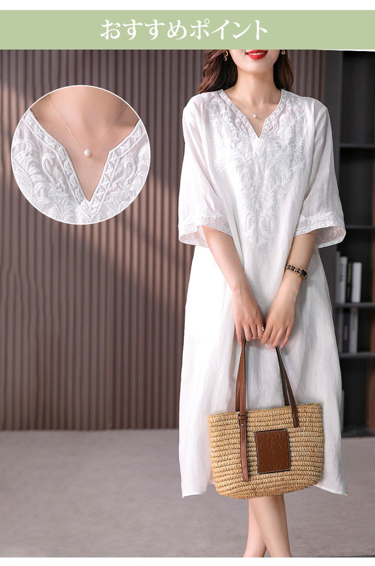 ナチュラルな雰囲気の刺繍入りワンピースの着用例
